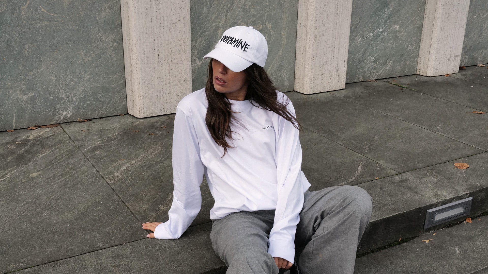 Ob weiß mit schwarzem Print oder beige mit Dopamine-Layern – jedes Piece ist ein Statement und ein Reminder, Glück groß zu tragen.